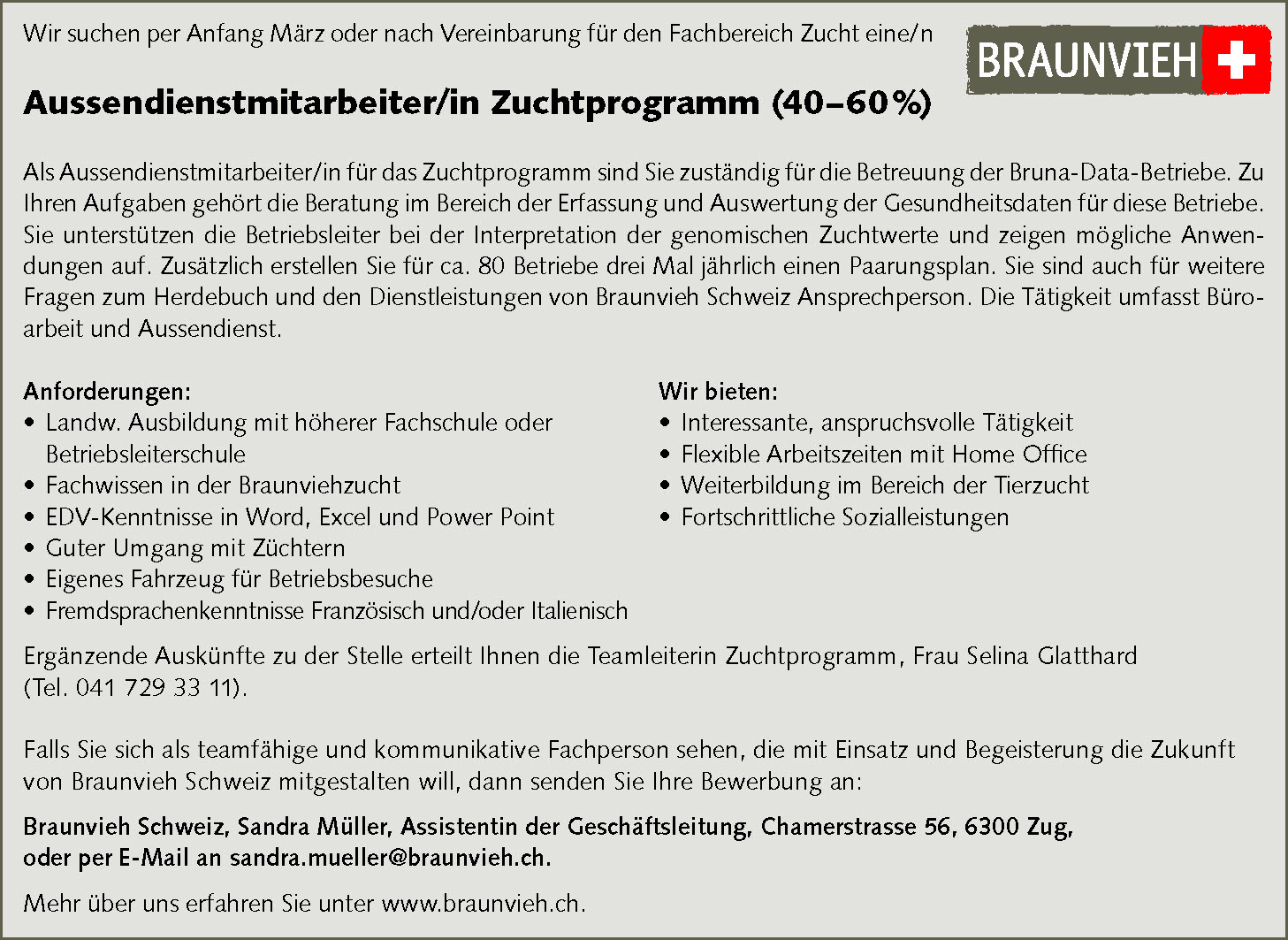 Jetzt bewerben: Braunvieh Schweiz bietet Ihnen eine interessante, anspruchsvolle Tätigkeit als Aussendienstmitarbeiter/in Zuchtprogramm.